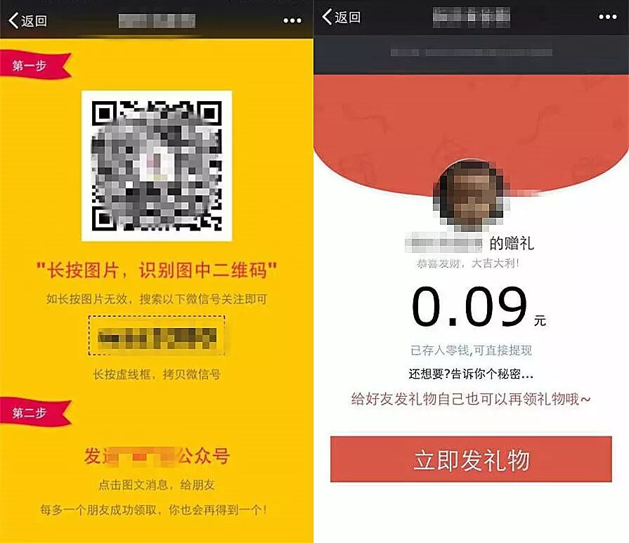 商户利用企业付款功能,当用户点击或分享图文消息即可收到企业付款,并在活动页面、提示语、入账详情等消息中包含诱导分享的语句。