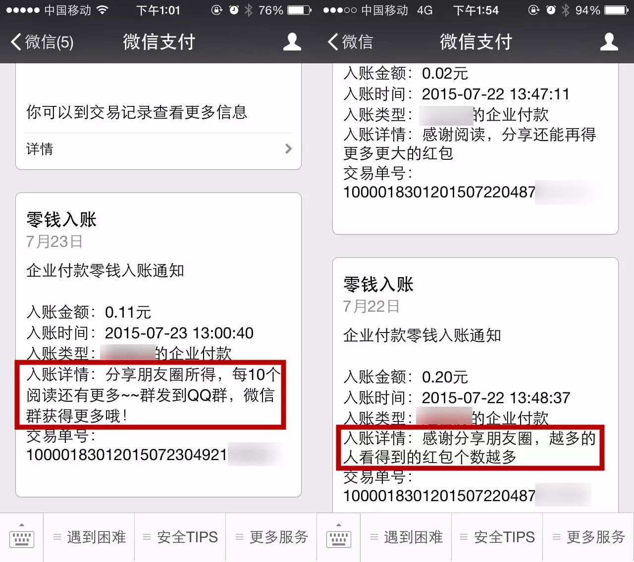 微信团队倡导企业及商户结合业务特色,合理使用企业红包及付款接口。比如,“延误险”公众号利用微信红包对用户进行保险理赔、“西安国税”通过二维码形式发放发票抽奖红包奖励以及通过企业付款功能向用户退款、发放优惠补贴等商家用户双方受益的方式,共建良好的微信生态。 |