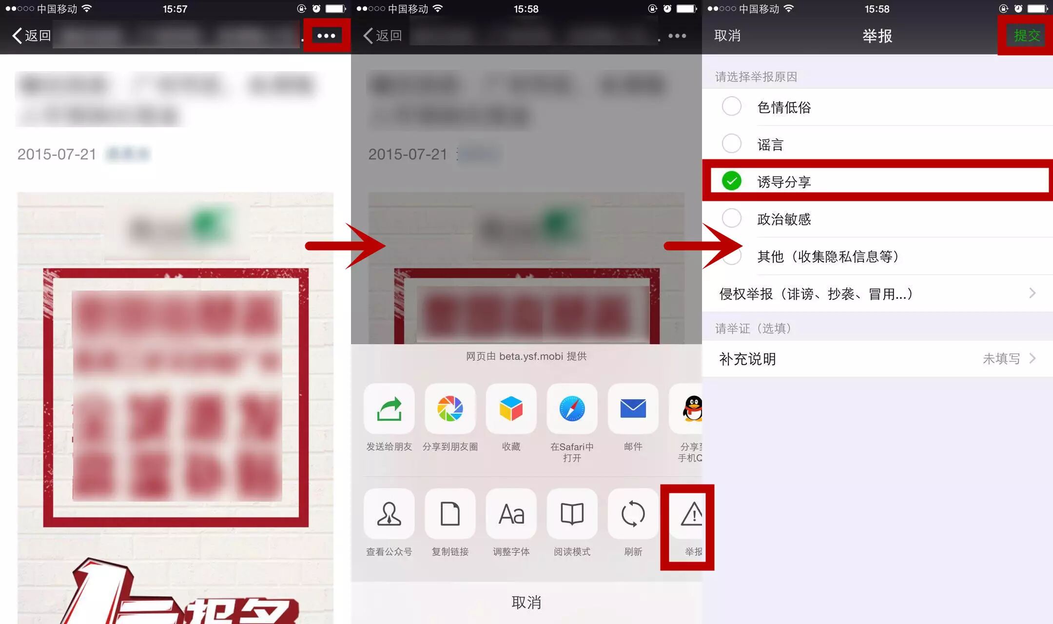 此外,用户一旦发现有企业通过以上方式进行诱导关注及分享,可通过举报功能自行举报,一经核实,微信将立刻作出处理。 用户只需点击图文消息界面右上方的【…】——【举报】,选择举报原因,点击提交即可。